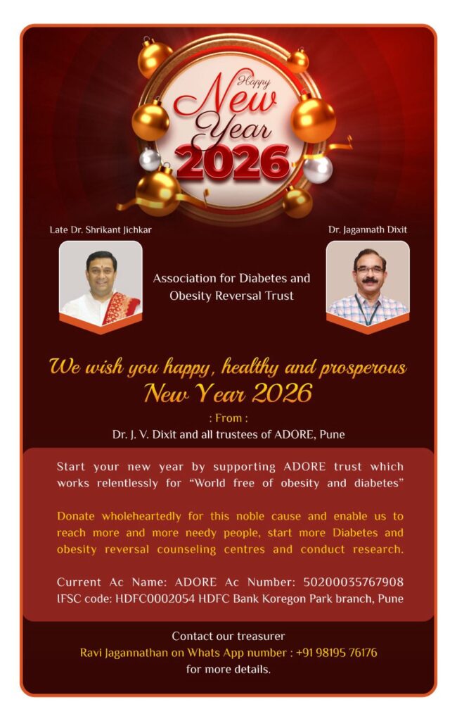 0 January 1, 2026 Posted by: adoretrust_admin Dr Dixit’s New Year Message 2026 January 1, 2026 0 Success Stories 0 1210 Previous Story Success Story: Yogesh Garajkar Next Story 8th Weightloss And Diabetes Reversal Challenge (2nd January 2026) Author adoretrust_admin Leave a Comment Cancel replyYour email address will not be published. Required fields are marked *Comment * Name * Email * Website Related Posts adoretrust_admin February 24, 2026 0 IMPORTANT INFORMATION : The Truth About HBA1C For INDIANS! ( 24th February 2026 ) Success Stories Read More adoretrust_admin February 24, 2026 0 Tip of the day : How much water one should drink everyday? ( 24th February 2026 ) Success Stories Read More adoretrust_admin February 23, 2026 0 Success Story : Sheetal Kulkarni Success Stories Read More
