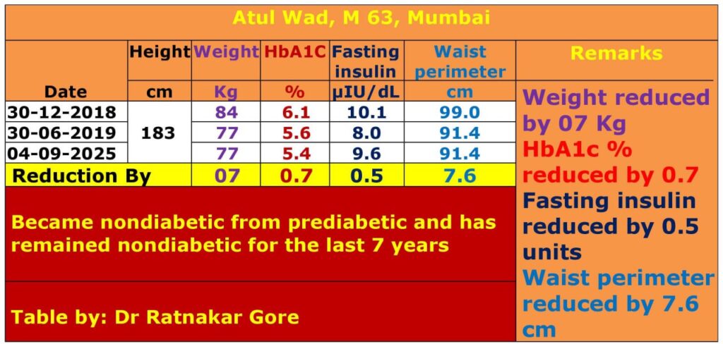 आता मागील ६ वर्षांपासून मी कोणतीही औषधे घेत नाही आणि माझे एचबीएवनसी ५.५ ते ५.७% या दरम्यान कायम आहे. मी दर ३-४ महिन्यांनी नियमित तपासणी करतो. जेव्हा आहारात काही वेगळे खातो, तेव्हा घरी ग्लुकोमीटरने रक्तातील साखर तपासतो. त्यामुळे मला आत्मविश्वास मिळतो आणि काय व किती प्रमाणात मला योग्य आहे हे समजते. सणासुदीला किंवा खास दिवशी मी अधूनमधून अतिशय मर्यादित प्रमाणात गोड पदार्थ खातो, ज्याचा माझ्या एचबीएवनसी वर परिणाम होत नाही. मात्र आयुष्यभर हीच जीवनशैली कायम ठेवणे आवश्यक आहे, याची मला पूर्ण जाणीव आहे.