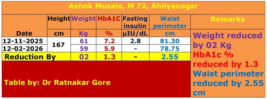 मी दिनांक ३१ जानेवारी २०१० ला सेवानिवृत्त झालो. त्या दिवशी आमच्या जिल्हा परिषद मध्ये आरोग्य शिबिर होतं तिथे सहज म्हणून तपासलं. डॉक्टरांनी सांगितले की रक्तशर्करा ३७० आहे, तरी स्पेशलिस्ट कडे जाऊन परत तपासून घ्या. त्यानंतर दोन-चार महिन्यांनंतर तपासणी केली. त्यात शुगर असल्याचे सिद्ध झालं मग नियमित मधुमेह तज्ञ डॉक्टरांच्या मार्गदर्शनाखाली फेब्रुवारी २०१८ पर्यंत औषधे घेतली. तीन-चार वर्ष शुगर कंट्रोलमध्ये होती परंतु नंतर औषधे खाऊन ही साखर वाढलेली येत होती. तेव्हा मी डॉक्टर प्रमोद त्रिपाठी यांचे व्हिडिओ पाहून त्यांनी सांगितलेली पथ्य, स्मुदी, अँटिग्रेविटी एक्सरसाइज करत राहिलो. माझ्या गोळ्या बंद झाल्या परंतु एचबीएवनसी ७-७.२% च्या आसपास राहत होती मी नोव्हेंबर डिसेंबर २०२५ पासून डॉ दीक्षित यांच्या अभियानात सामील झालो. तीन महिने या जीवनशैलीचे पालन केल्यानंतर १२ फेब्रुवारीला मी माझ्या सर्व टेस्ट पुन्हा करून घेतल्या. किडनी लिव्हर फंक्शन कोलेस्टर लिपिड प्रोफाइल सर्व नॉर्मल आले आणि एचबीएवनसी ७.२% पासून कमी होवून ५.९% झाली. आज माझं वय ७२ वर्षे असलं तरी मी तरुणासारखा सकाळी एक तास आणि संध्याकाळी एक तास एकूण १२ किलोमीटर फिरतो. त्यापूर्वी अर्धा तास जिने चढ-उतार करतो आणि हेल्दी लाईफ जगतो.