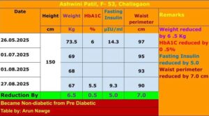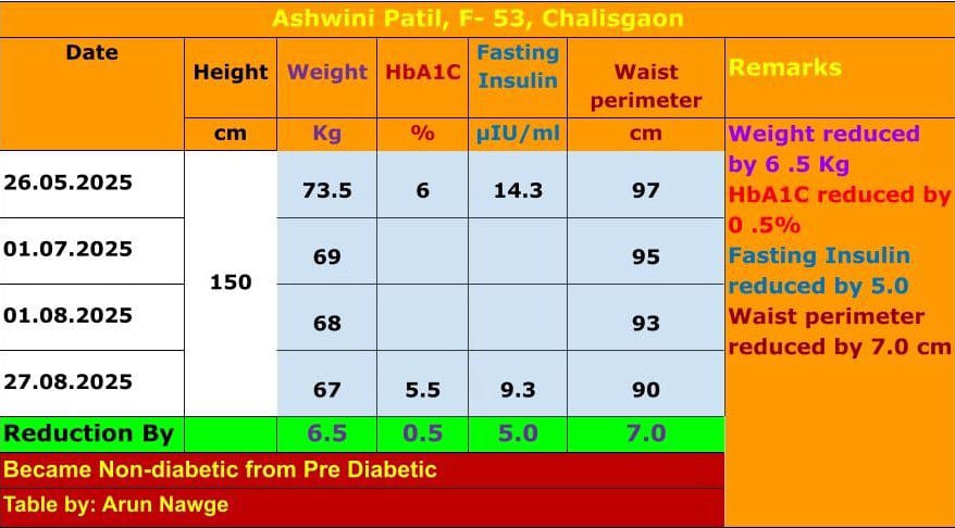 मी पूर्व-मधुमेहीची मधुमेहमुक्त झाले. माझी बीपीची एक गोळी बंद झाली.