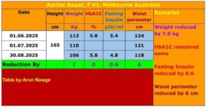 पहिल्याच महिन्यात माझ्या वजनात आणि कंबरेच्या मापात लक्षणीय घट दिसून आली. उपाशीपोटी इन्सुलिनचे प्रमाणही कमी झाले. या सुरुवातीच्या परिणामांनी मला मोठी प्रेरणा मिळाली.