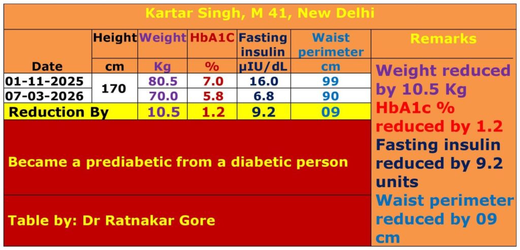 सध्या माझे एचबीएवनसी ५.८% आहे आणि उपाशीपोटी इन्सुलिन ६.८ आहे. मी स्वतःला वचन दिले आहे की मी नेहमी डॉ. दीक्षित जीवनशैलीचे पालन करेन आणि लवकरच मी मधुमेहमुक्त होईन.