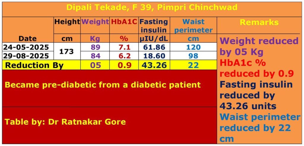 पहिल्या महिन्यात मला उल्लेखनीय यश मिळाले. एचबीएवनसी ७.१ वरून ६.६% वर आला, उपाशीपोटी इंसुलिन ६२ वरून ९.९ यूनिट पर्यंत कमी झाला. वजन ४.५ किलोने घटले आणि कंबर १०८ सें.मी. पर्यंत कमी झाली. या बदलामुळे मला मोठा आत्मविश्वास मिळाला.