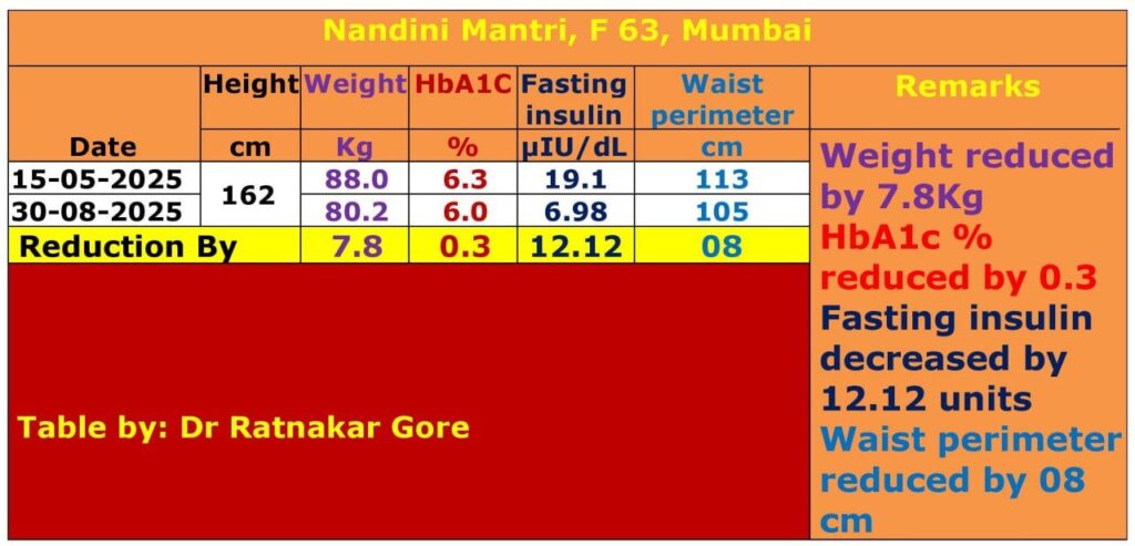 मी प्रथम 2015 साली एका T.V. Show मध्ये डॉ दीक्षित सरांची मुलाखत पाहिली होती. डॉ दीक्षित जीवनशैलीचा उपयोग करून मी माझे वजन उतरवले होते. तेव्हां सरांनी दोन वेळा जेवा, जेवण 55 मिनिटांत संपवा व साडे चार कि.मी. 45 मिनिटांत रोज चाला एवढेच सांगितले होते. माझे वजन कमी झाले होते पण नियमितता नव्हती त्यामुळे परत वजन वाढले. ह्या वर्षी मार्च 2025 मध्ये माझा रक्तदाब वाढला म्हणून आमच्या फॅमिली डॉक्टरने मला गोळी चालू केली; तेव्हां मी त्यांना विचारले,ही गोळी कधी बंद होईल तेव्हां ते म्हणाले, वजन कमी झाले तर गोळी बंद होईल म्हणून मी वजन कमी करण्यासाठी डॉ दीक्षित जीवनशैलीचा उपयोग करण्याचे ठरवले.”YouTube ” वर सरांची व्याख्याने पाहताना असे कळले की, जेवण क्रमवार पद्धतीने 55 मिनिटांत संपवायचे आहे. ड्राय फ्रुटस-सॅलड-मोड आलेले कडधान्य-पोळी भाजी किंवा आमटी भात. शक्यतो पिष्टमय पदार्थ कमी खायचे. मे 2025 मध्ये YouTube वर मला 90 दिवसाचे वेट लॉस आव्हान अभियांनाबद्दल कळले आणि ठरवले की आपण पण या अभियांनाचा भाग होऊन वजन कमी करून BP ची गोळी बंद करायची. या अभियानात सांगितल्याप्रमाणे एचबीएवनसी व उपाशीपोटी इन्सुलिन ची टेस्ट केली.रिपोर्ट बघितल्यावर कळले की मी पूर्व मधुमेही आहे. मग ठरवले की आपण या अभियांनात सांगितलेल्या गोष्टी काळजीपूर्वक पाळायच्या. हे 90 दिवस हा माझ्या आयुष्यातील शिस्तबद्ध, सकारात्मक, आनंदी व आशावादी कालखंड होता. दिवसातून फक्त 2 वेळा खाणे, प्रत्येकाने पोस्ट केलेले जेवणाच्या थाळीचे फोटो, चालण्याचा स्क्रिनशॉट पाठवणे, योगा, दैनंदिन व्यायाम (डॉ. अष्टेकर मॅडम), रविवार व्याख्याने, समूहातील क्रियाकलाप(activity)त्याचे फोटो पाठवणे, रोजचा गुगल फार्मभरुन पाठवणे यावर अँडमिनचे कटाक्षाने लक्ष व मार्गदर्शन यामुळेच अंगी नियमितता, जागरुकता व शिस्त आली. छान चविष्ट नवीन रेसिपीज करून पाहणे हे प्रेरणादायी होते त्यामुळेच शरीरांतर्गत चांगले बदल दिसून आले. हा जीवन बदलून टाकणारा अभियान चालू केल्याबद्दल डॉ दीक्षित सरांचे मनापासून आभार मानते तसेच आमच्या ग्रुपच्या ॲडमिन अनघा काळे, लीना मॅडम, मेधा मॅडम यांचे वेळोवेळी मार्गदर्शन व प्रोत्साहन मिळाले त्यामुळे त्यांचेही मनापासून आभार मानते. डॉ दीक्षित जीवनशैली पाळताना माझे पती श्री. नितीन प्रभाकर मंत्री यांनी मला दिलेली मोलाची साथ, वेळोवेळी दिलेले प्रोत्साहन, माझ्या जेवणाचे,व्यायामाचे,चालण्याचे स्क्रीन शॉट तसेच रोजचा गुगल फार्मभरुन पाठवणे आठवणीने न कंटाळता केले त्याबद्दल मी कृतज्ञता व्यक्त करते.