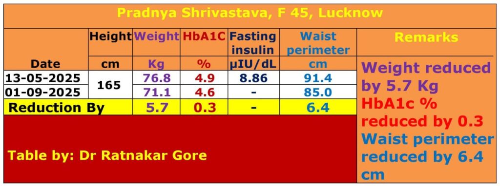 इतर सुधारणा: उर्जेची पातळी वाढली, गुडघ्यांच्या वेदनांमध्ये घट झाली। या चॅलेंजमधील सर्वात मोठा फायदा म्हणजे चांगल्या सवयींची निर्मिती। आता मला माझ्या खाण्याच्या इच्छांवर (cravings) अधिक नियंत्रण आहे, मी अन्नाचे सेवन आणि निवड याबाबत अधिक शिस्तबद्ध आहे। माझ्या मते, अन्न घेण्याचा क्रम हा गेम चेंजर आहे! कारण अन्नाचा योग्य क्रम पोषणमूल्य वाढवतो आणि कॅलरीचे सेवन कमी करतो। यामुळे अधिक वेळ पोट भरल्यासारखे वाटते, साखर आणि इन्सुलिनचे अचानक वाढणे कमी होते।