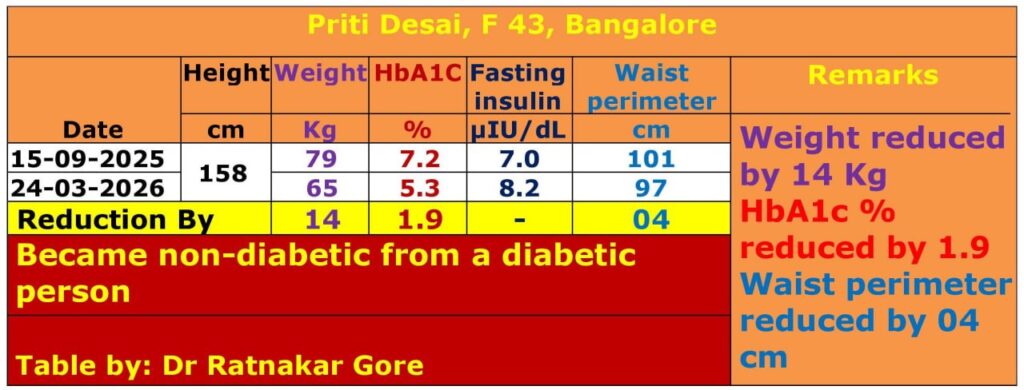 मी बेंगळुरूमध्ये राहते. सप्टेंबर २०२५ मध्ये केलेल्या नियमित तपासणीत मला कळले की माझे एचबीएवनसी ७.२% आहे, वजन ७९ किलो आहे आणि मी मधुमेहाच्या अवस्थेत आहे.