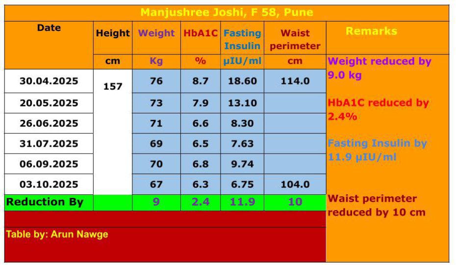 मी पूर्ण निष्ठेने यात सहभागी झाले — जेवणाचे फोटो शेअर करणे, व्यायामाचे अपडेट्स देणे आणि प्रोग्राममध्ये शिकवलेल्या शिस्तीचे पालन करणे मी सुरू ठेवले. पहिल्याच महिन्यात माझा एचबीएवनसी ८.७ वरून ७.९% वर आला, उपाशीपोटी इन्सुलिन १८.६ वरून १३.१ यूनिट वर आले आणि माझे ३ किलो वजन कमी झाले. पुढच्या काही महिन्यांत या सर्व पॅरामीटर्समध्ये मला सातत्याने सुधारणा दिसून आली.