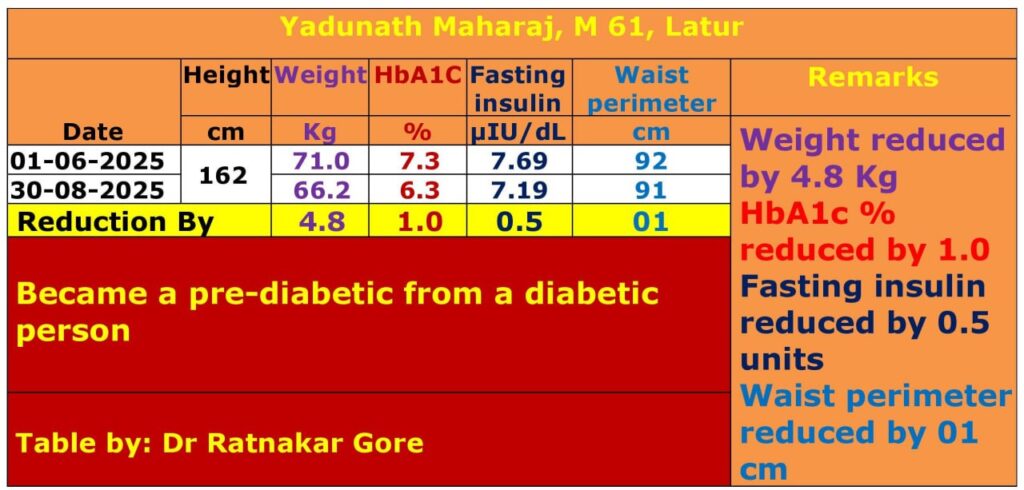 मला २०१७ साली शुगर डिटेक्ट झाली. २०१९ साली माझे बायपास ऑपरेशन झाले.त्यानंतर माझी शुगर आटोक्यात येतच नव्हती. ऑपरेशन व शुगर मुळे मला दातांचे व डोळ्यांचे विकार सुरु झाले. मे-२०२५ रोजी माझे मित्र संजीव गोबाडे यांनी डॉ दीक्षित जीवनशैलीबद्दल सांगितले व वंदना जोशी, नाशिक यांना जोडून दिले. मॅडमनी मला डॉ दीक्षित जीवनशैलीची नीट ओळख करून दिली. त्याप्रमाणे मी ही जिवनशैली पूर्णपुणे अंगिकारली. योगायोगाने ७ वा वेटलॉस व मधुमेह मुक्त कार्यक्रम जाहीर झाला. मॅडमनी मला त्यात जोडून दिले. मी दररोज सकाळी ४.५० कि.मी.चालण्याचा नियमीत व्यायाम करत असे. सकाळी कमी दुधाचा बिन साखरेचा चहा फक्त एकदाच घेत असे. त्यानंतर बरोबर दुपारी १२ ते १२.३० घ्या आत व संध्याकाळी ७. ते ७.३० घ्या सुमारास जेवण घेत असे. जेवणात मी प्रथम भिजवलेले शेंगदाणे, चार बदाम, चार अक्रोड, संलाद, मोड व त्यानंतर नियमीत जेवण घेत असे. दोन जेवणाच्या मध्ये मी काहीही घेतले नाही. तीन महिन्यांनंतर मी मधुमेही मधून पूर्व-मधुमेही झालो आहे. लवकरच मी मधुमेहमुक्त होईन यांची मला खात्री आहे. माझी मधुमेह व हृदयविकाराची औषधे मला पूर्णपणे बंद करण्याची माझी इच्छा आहे व ती बंद होतील याची देखील मला खात्री आहे. ही जीवनशैली मी यापुढेही चालू ठेवणार आहे.