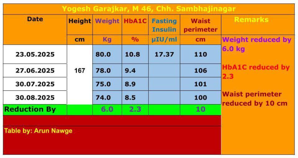 मी योगेश गारजकर मला डॉ. दीक्षित सरांच्या जीवनशैलीची माहिती २०१८ ला पहिल्यांदा मिळाली, पण माझ्याकडून काही पाळणे झाले नाही. ०१ जून २०२५ ते ३० ऑगस्ट २०२५ पर्यंत चालणाऱ्या “डॉ. दीक्षित ९० दिवसीय वेट लॉस आणि मधुमेह रिवर्सल चॅलेज ” मध्ये भाग घेतला आणि या जीवनशैलीचे पालन करण्यास सुरुवात केली. त्यावेळी रक्त चाचणी मध्ये एचबीएवनसी १०.८ % व उपाशीपोटी इंसुलिन १७.३७ यूनिट निघाले. वजन ८० किलो आणि पोटाचा घेर ११० सेंमी होता.