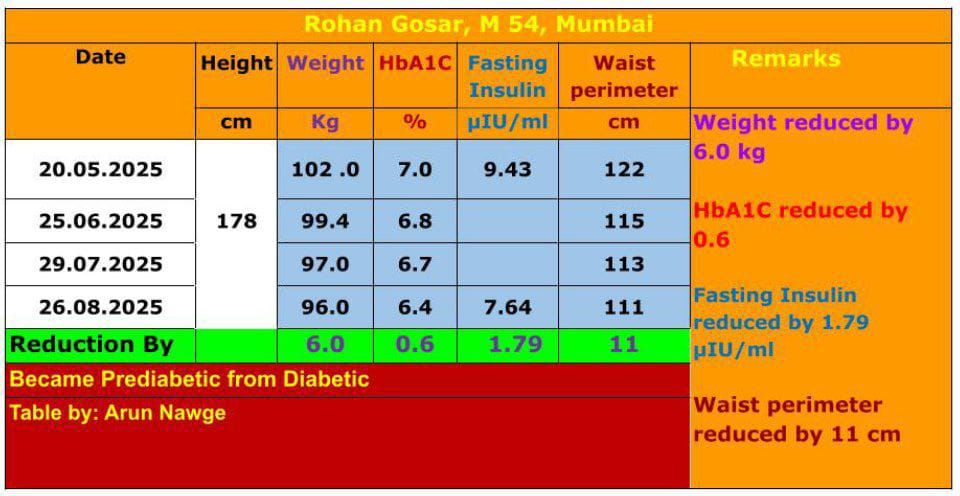पहिल्याच महिन्यात सकारात्मक बदल दिसून आले.— वजनात घट झाली आणि साखरेच्या पातळीत सुधारणा झाली. पुढील महिन्यांमध्ये ही प्रगती सातत्याने सुरू राहिली. वजन तसेच वैद्यकीय तपासणी अहवालांमध्ये लक्षणीय सुधारणा दिसून आली.