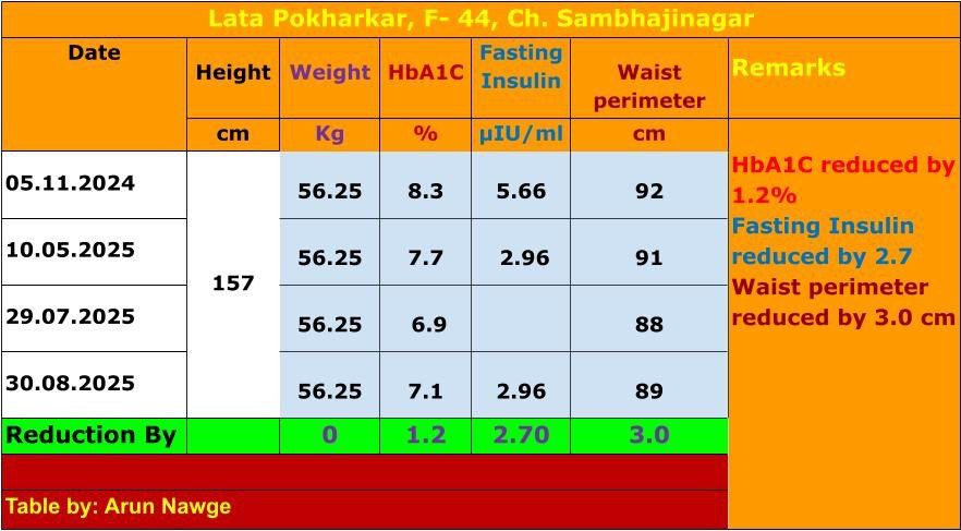 मी ९० दिवसांच्या वजन कमी करण्याच्या आव्हानात उत्साहाने भाग घेतला. दररोज सकाळी आणि संध्याकाळी ग्रुपवर माझ्या जेवणाच्या ताटाचे फोटो उत्साहाने शेअर केले. दररोज ६-७ किमी चालत असे. ग्रुप अॅडमिन श्रीनिवास सर आणि निखिल नाफडे सर मला दररोज प्रोत्साहन देत असत. दर आठवड्याच्या शेवटी काही ना काही उपक्रम होत असत आणि मी त्यात मोठ्या उत्साहाने भाग घेत असे. तीन महिन्यांत मी एक-दीड किलो वजन कमी केले. माझ्या पोटाचा घेर ९२ सेमी वरून ८९ सेमी पर्यंत कमी झाला आणि माझे एचबीएवनसी ६.९ पर्यंत कमी झाले. या यशाने मी खूप आनंदी आहे. मी निरोगी जीवनाकडे पावले टाकत आहे. मला विश्वास आहे की मी लवकरच मधुमेहमुक्त होईन. याचे सर्व श्रेय डॉ. जगन्नाथ दीक्षित यांच्या निस्वार्थ कार्याला जाते. मी डॉ. दीक्षित सर आणि संपूर्ण अॅडमिन टीम आणि सरांच्या कार्यात सहभागी असलेल्या प्रत्येकाचे मनापासून आभार मानते. मी आमचे अॅडमिन श्रीनिवास सर, नाफडे सर आणि या प्रवासात मला पाठिंबा आणि मार्गदर्शन करणाऱ्या मेघना मॅडम, डीटीसीच्या अनिता बहेकर मॅडम, रत्नपारखी सर, भालेराव सर या सर्वांचे विशेष आभार मानते.