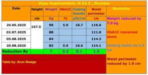 प्रशासक श्रीमती अनघा काळे आणि श्रीमती लीना पाटील यांच्या मार्गदर्शनाखाली, मी पहिल्या १५ दिवसांत ५ किलो वजन कमी केले. डॉ. दीक्षित यांनी मला वैयक्तिकरित्या प्रोत्साहन दिले, परंतु बेपर्वाई विरुद्ध इशारा देखील दिला. दुर्दैवाने, मी सण आणि सामाजिक कार्यक्रमामध्ये रमलो, ज्यामुळे मला वारंवार “चीट डे” घ्यावे लागले. शिस्तीचा अभाव असूनही, माझे ९० दिवसांचे निकाल चांगले होते: