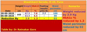 मला मधुमेह, वजन वाढ समस्यांमुळे दैनंदिन जीवनात खूप अडचणी येत होत्या. मला डॉ. दीक्षित जीवनशैली आणि 90 दिवसांचे चॅलेंज बद्दल माहिती मित्रा द्वारे मिळाली हे चॅलेंज ३१ मे पासून सुरू होणार असल्याचे कळल्यावर मी ठाम निर्णय घेतला. कुटुंबीय आणि मित्रांना खात्री नव्हती, पण मी पूर्णमनाने हे चॅलेंज करण्याचे ठरवले. मी पूर्ण शिस्त पाळली: जेवणाचे फोटो शेअर केले व्यायाम/क्रियाकलाप अपडेट केले आणि प्रोग्राममध्ये शिकवलेल्या सवयी अंगीकारल्या