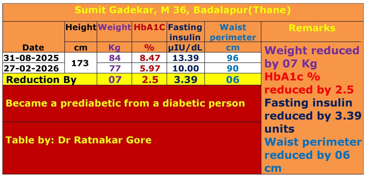 सप्टेंबर ते फेब्रुवारी या पाच महिन्यांच्या कालावधीत माझे वजन ८४ किलोवरून ७७ किलोपर्यंत कमी झाले. त्याहून महत्त्वाचे म्हणजे माझे एचबीएवनसी प्रमाण ८.४ वरून लक्षणीयरीत्या कमी होऊन ५.९६% पर्यंत आले, जे आता पूर्व-मधुमेही मर्यादेत आहे.