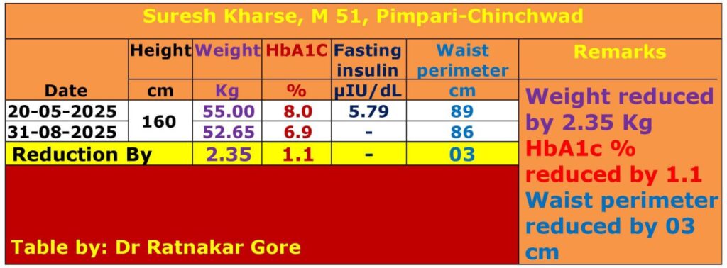 मला मधुमेह, या समस्यांमुळे दैनंदिन जीवनात खूप अडचणी येत होत्या. मला डॉ. दीक्षित जीवनशैली आणि 90 दिवसांच्या चॅलेंज बद्दल सोशल मिडिया वरून मिळाली. हे चॅलेंज १-६-२५ पासून सुरू होणार असल्याचे कळल्यावर मी ठाम निर्णय घेतला. कुटुंबीय आणि मित्रांना खात्री नव्हती, विशेषतः सणांमुळे, पण मी पूर्णमनाने हे चॅलेंज करण्याचे ठरवले. कधी कधी मला नाही जमलं ते कामाच्या किंवा वैयक्तिक अडचणी मुळे जेवणाचे फोटो किंवा व्यायामाचे अपडेट नाही पाठवता आले. त्याबद्दल खरंच मनापासून माफी मागतो. मी प्रोग्राममध्ये शिकवलेल्या सर्व सवयी अंगीकारल्या. मला पहिल्या महिन्यातच माझी रक्तशर्करा कमी झाल्याचे दिसलं. जे २० वर्षात झाले नाही ते पहिल्या महिन्यातच झाले. पुढील महिन्यांमध्ये अजून प्रगती झाली.