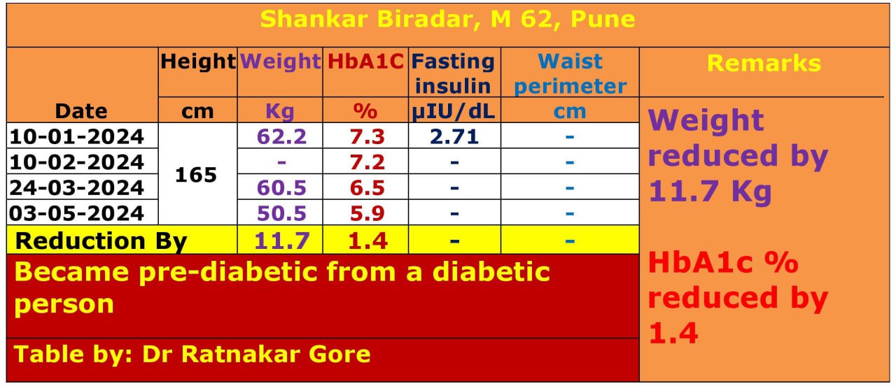 आता मे महिन्यात माझे एचबीएवनसी ५.९% झाले व मी मधुमेही मधून पूर्व मधुमेही झालो. मी अश्विनी मॅडम व आदरणीय डॉ दीक्षित सरांचा अत्यंत आभारी व ऋणीही आहे. त्यांच्या पूर्ण टीमला हार्दिक शुभेच्छा व्यक्त करतो व सर्वांना Health, Wealth and Happiness मिळो अशी देवाला प्रार्थना करतो. मी ही जीवनपद्धती आयुष्यभर करुन मधुमेह मुक्त्त होणार आहे.