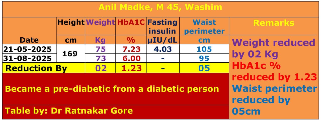 The biggest realization of my life is: [personal experience – e.g., complete control over food cravings, adopting discipline, improved mindset, etc.]. I watched many YouTube videos of Dr. Dixit. Through those videos, I understood his clear explanations, selfless attitude, and concern for diabetic patients. I felt inspired and decided that I would conquer diabetes through Dr. Dixit lifestyle. The work being done by all the members through Adore Trust is beyond words. It is a great service.