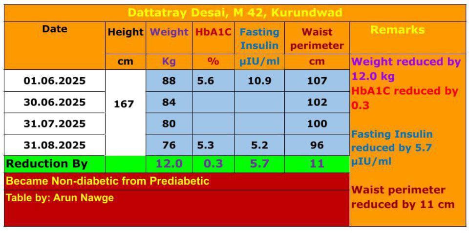 I have become diabetes-free from pre-diabetes without any medication. I am very happy because I have lost 12 kg. I feel light and my enthusiasm has increased.