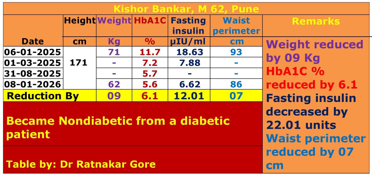 Initially, in January 2025, I took medicines for 15 days. After that, I stopped the medication and started following the Dr. Dixit lifestyle. I began running 6.00 km every morning and started eating only two meals a day. This increased my enthusiasm, reduced my weight, and reduced my abdominal circumference. My HbA1c and fasting insulin levels also decreased, and I became diabetes-free, which gives me immense happiness.