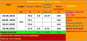 I am Madhavi Karwa. I am 38 years old and have been suffering from weight gain for a long time. I wanted to lose weight but could not find a way. It was exactly like the saying, “I know what to do, but I don’t follow it”. In May 2025, I came to know about Dr. Dixit Sir’s 90-days weight loss challenge from my elder brother- in- law. He insisted that we must participate in this challenge. When I did a blood test, I came to know that I was pre-diabetic.
