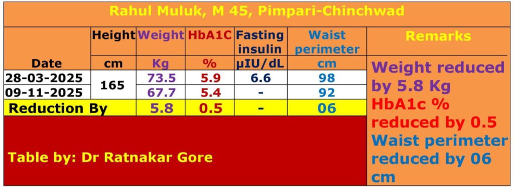 By chance, I watched Dr. Dixit sir’s video on YouTube and visited the center on J.M. Road. The sir there guided me properly, and I started following the diet and walking as advised. However, due to work, it was not regular. Meanwhile, this challenge was announced, and I decided from my heart to participate in it. After joining the challenge, Anjali Madam and Kavita Madam provided excellent guidance. Because of their guidance, my HbA1c reduced from 5.9 to 5.4%. My weight reduced by approximately 5 to 6 kg.