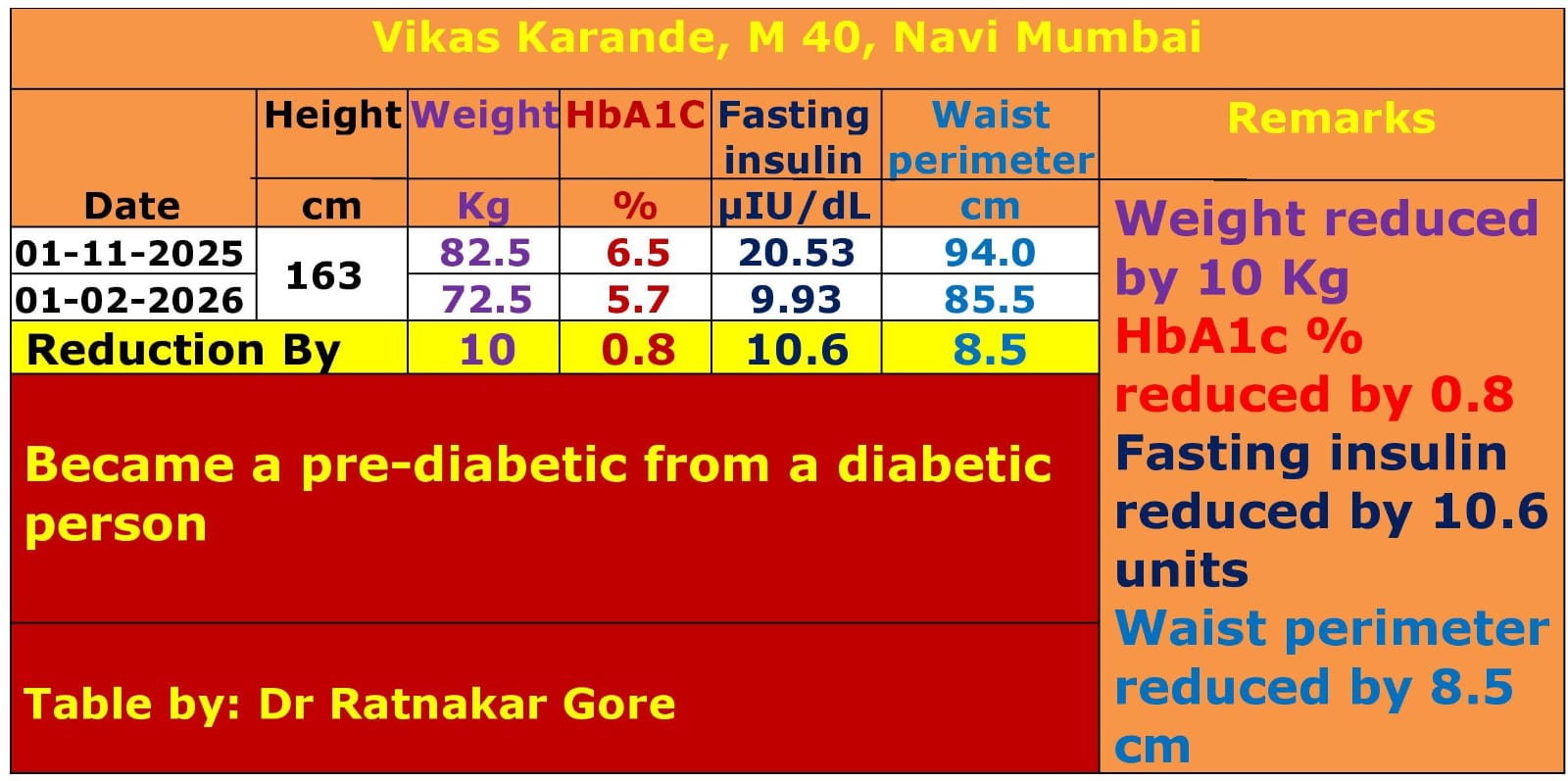 After three months, I repeated my tests, and the results were highly positive. This increased my motivation and strengthened my belief in this lifestyle. Within these three months, I moved from diabetic to pre-diabetic status and reduced my weight by 10 kg. My reports are provided in the accompanying table.
